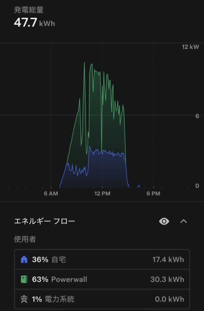 今日は午前中こそ曇天でしたが、昼前から一気に発電量が伸びました。 結果として発電量47.7kWhを確保し、Powerwallが安定的に動作。 買電はわずか0.1kWhにとどまり、ほぼ完全な自給運転を維持できました。