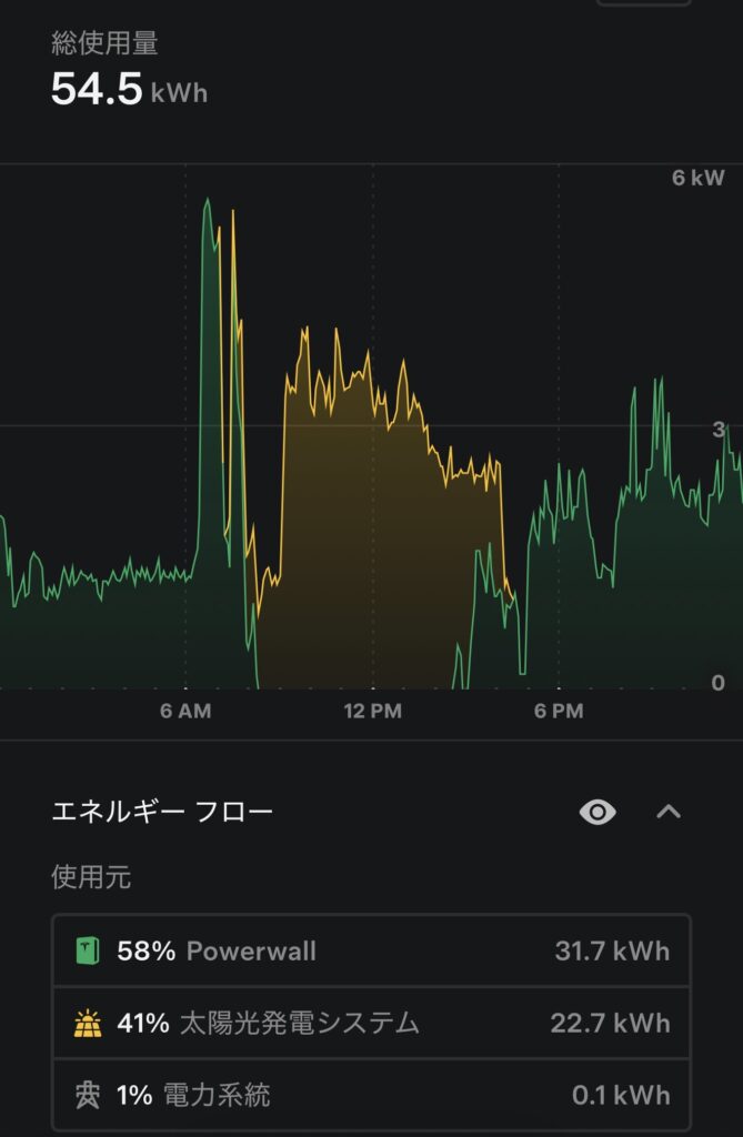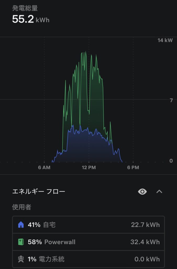 早朝6時台にかけて発電が一気に立ち上がり、正午前後にはPowerwallへの充電を集中実施。 昼間はエコキュートと家電を太陽光でまかないながら余剰を蓄電しました。