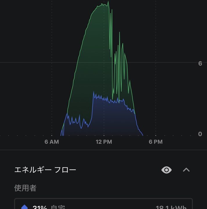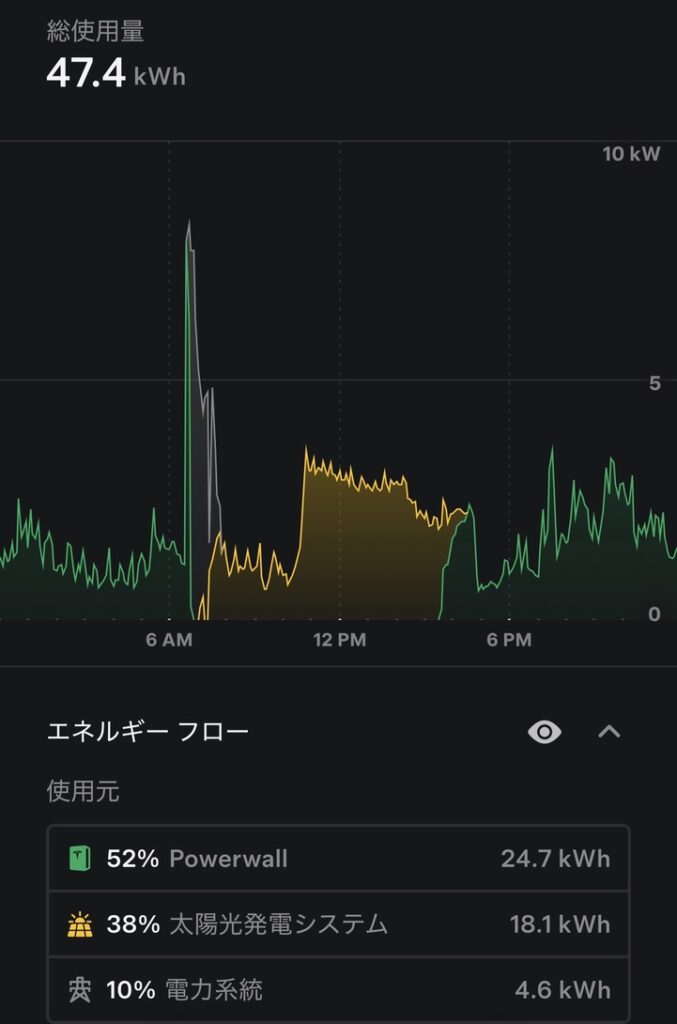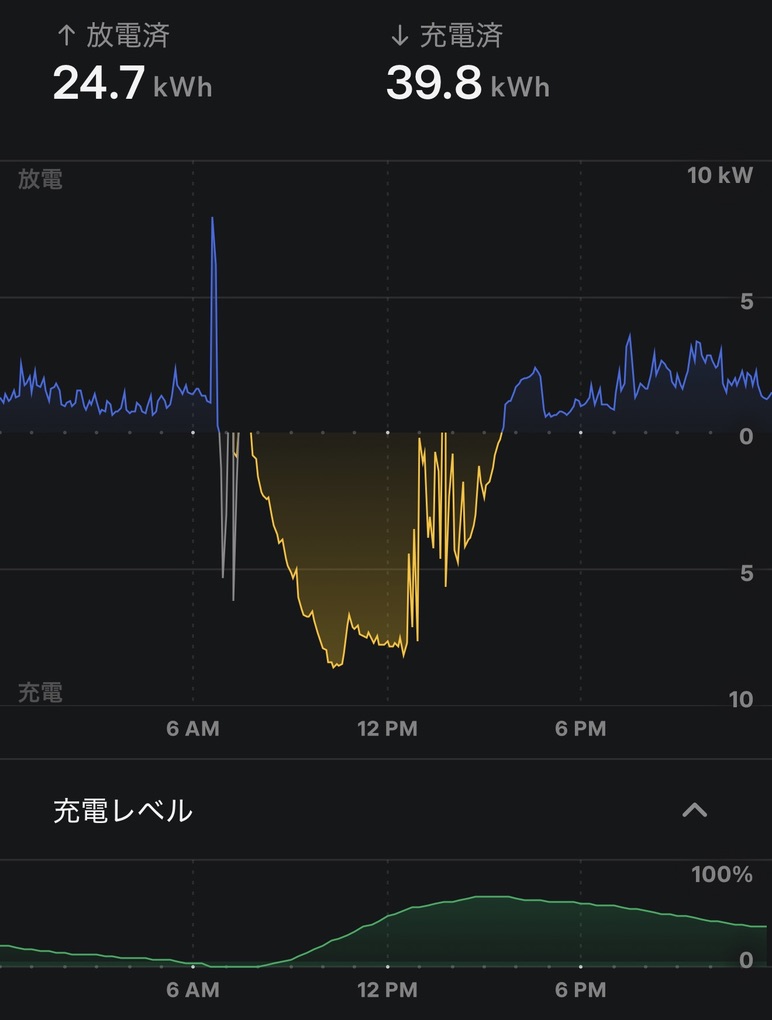 日の出前後の電力はPowerwallが供給し、暖房やEV充電を支援。 朝6時以降、発電が立ち上がると充電モードへ自動切り替え。 短時間ながら高出力充電が行われ、エネルギー効率を最大化しました。