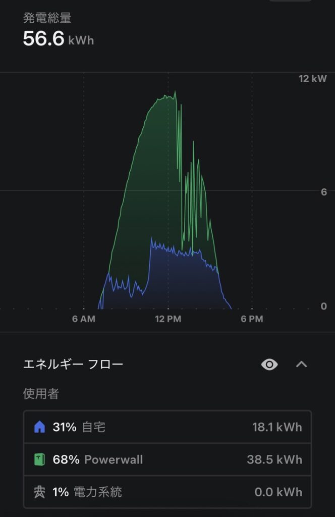 冬の澄んだ空気と快晴に恵まれた一日。 太陽光発電が午前中から力強く立ち上がり、発電量は56.6kWhを記録。 Powerwallが効率的に充電され、家庭の電力使用47.4kWhのうち約90%を自給電力でまかないました。