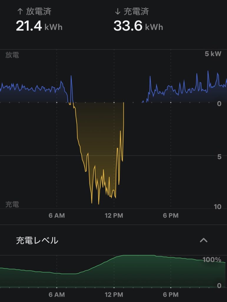 放電は21.4kWh、充電は33.6kWh。昼間の発電が多かった分、バッテリーの充電率も順調に上がり、夕方以降は蓄電でカバー。夜間の安定供給にも十分余裕がありました。
