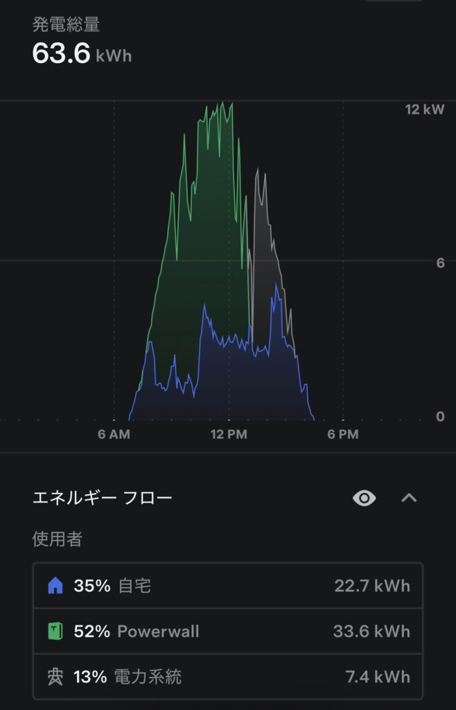 発電63.6kWh、充電33.6kWhと好調。Powerwallがしっかり働いて、系統電力の使用を最小限に抑えられた一日でした。曇りがちな空でも、自然エネルギーの底力を実感。