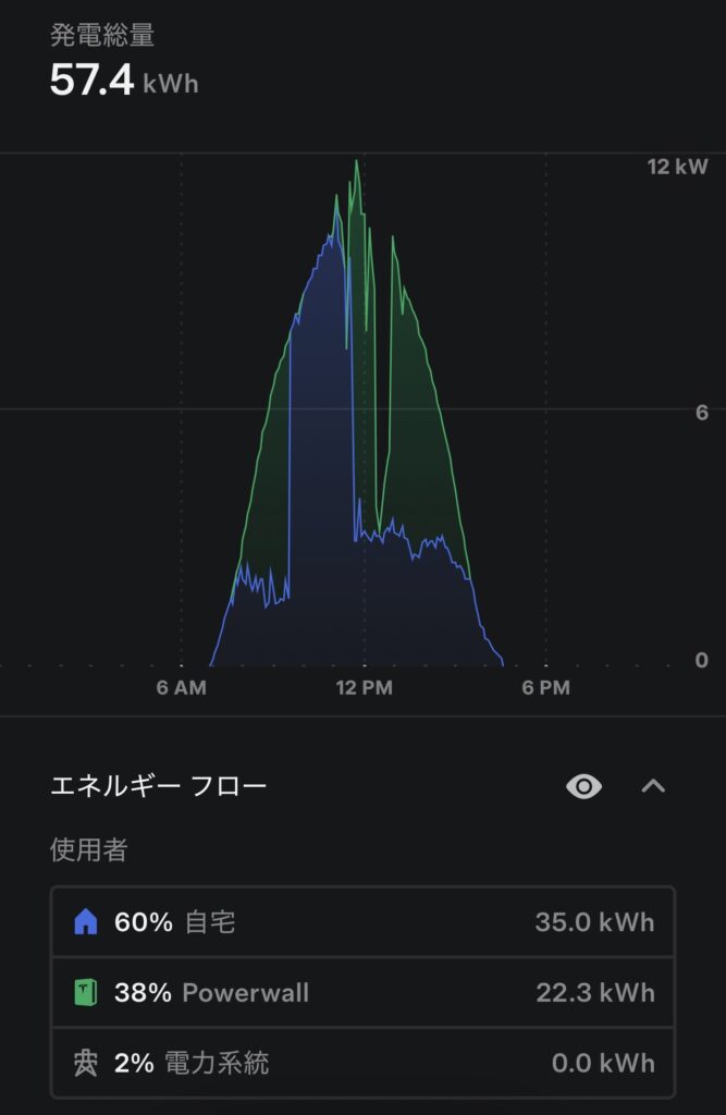 発電グラフは理想的な山形カーブを描き、ピークは正午前後で約11〜12kW。 Powerwall充電とのバランスも良く、日中の発電を無駄なく活用できました。 雲の影響が少なかったことから、太陽光53%・蓄電46%という高効率稼働が実現しています。