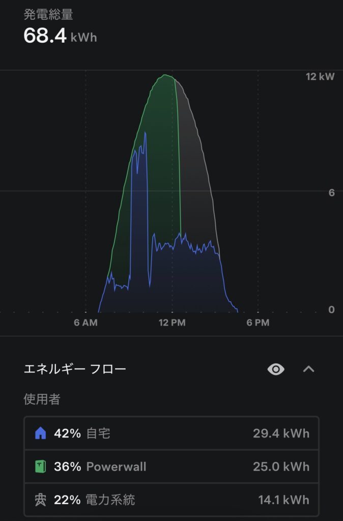 午後は曇りがちでしたが、発電量は68kWhと高水準。