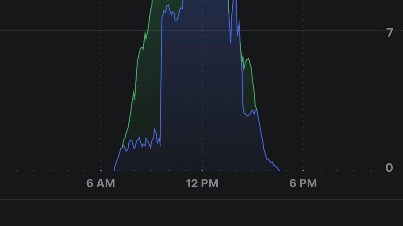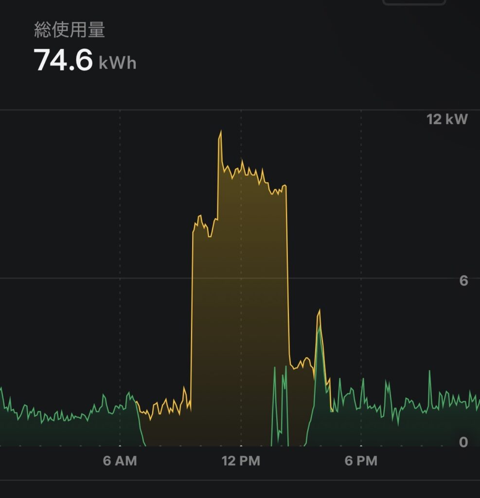 今日の総電力は 74.6kWh。朝から日差しが強く、日中は電力消費も自然と増加。それでも発電が追いつき、システム全体が安定して動いていました。昼過ぎには発電ピークが訪れ、家庭内電力はほぼ太陽光でまかなえています。