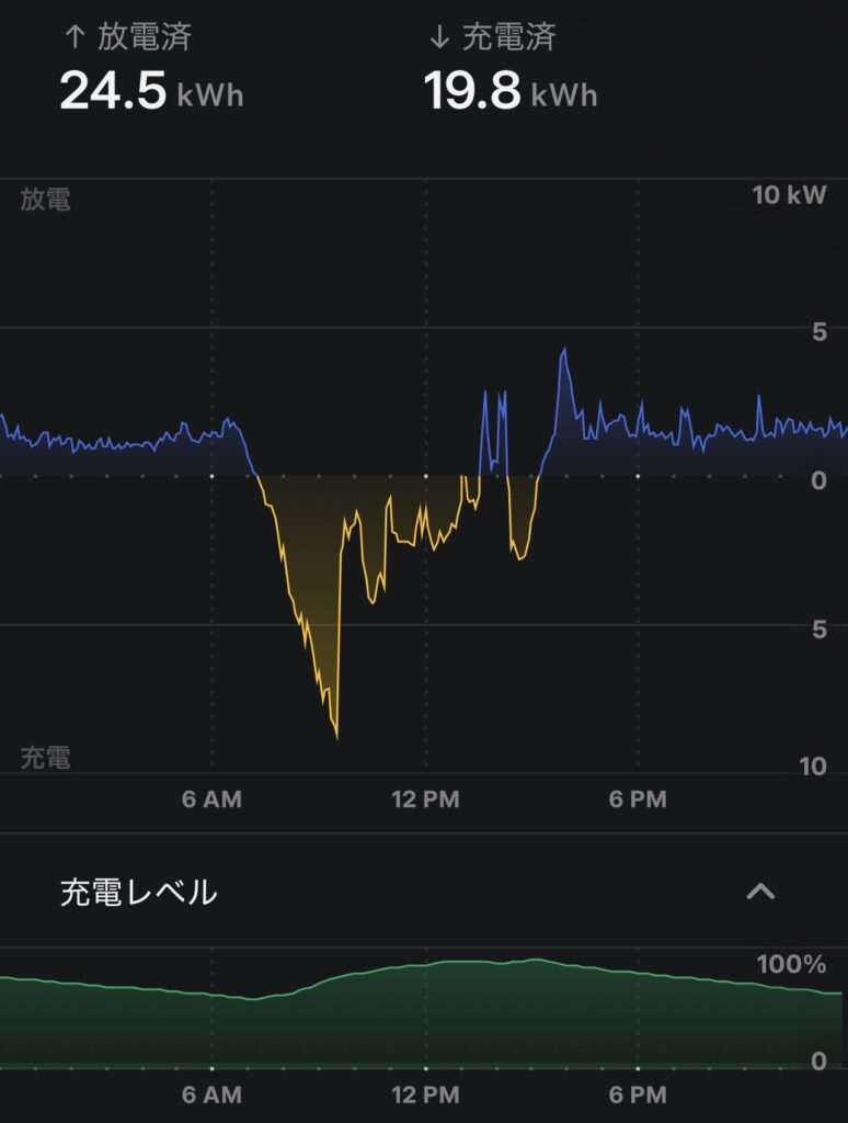 今日の放電量は 24.5kWh、充電量は 19.8kWh。