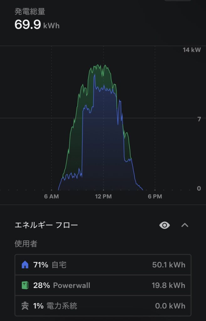 朝の立ち上がりから夜まで、Powerwallがしっかりと電力を支えてくれました。日中の充電効率も良く、夜間の放電もスムーズ。電力系統への依存度はわずか1%と、実質的には完全オフグリッド状態。