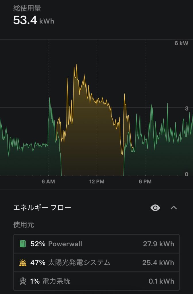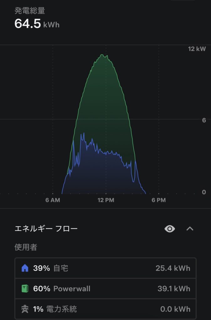 今日はオフグリッド生活の理想形ともいえる一日で、太陽光とPowerwallだけでほぼ全ての電力需要を賄うことができました。売電より自家消費を優先する運用に切り替えたことで、数字にも安心感にもはっきりと成果が表れています。