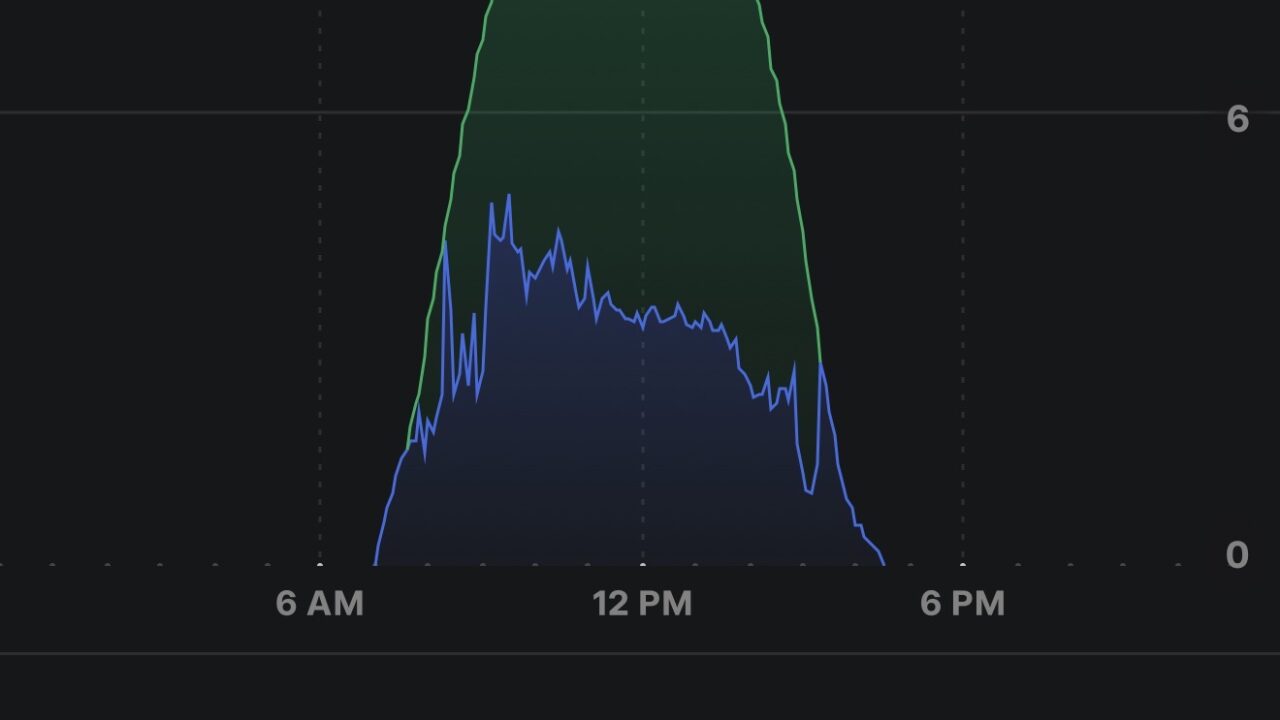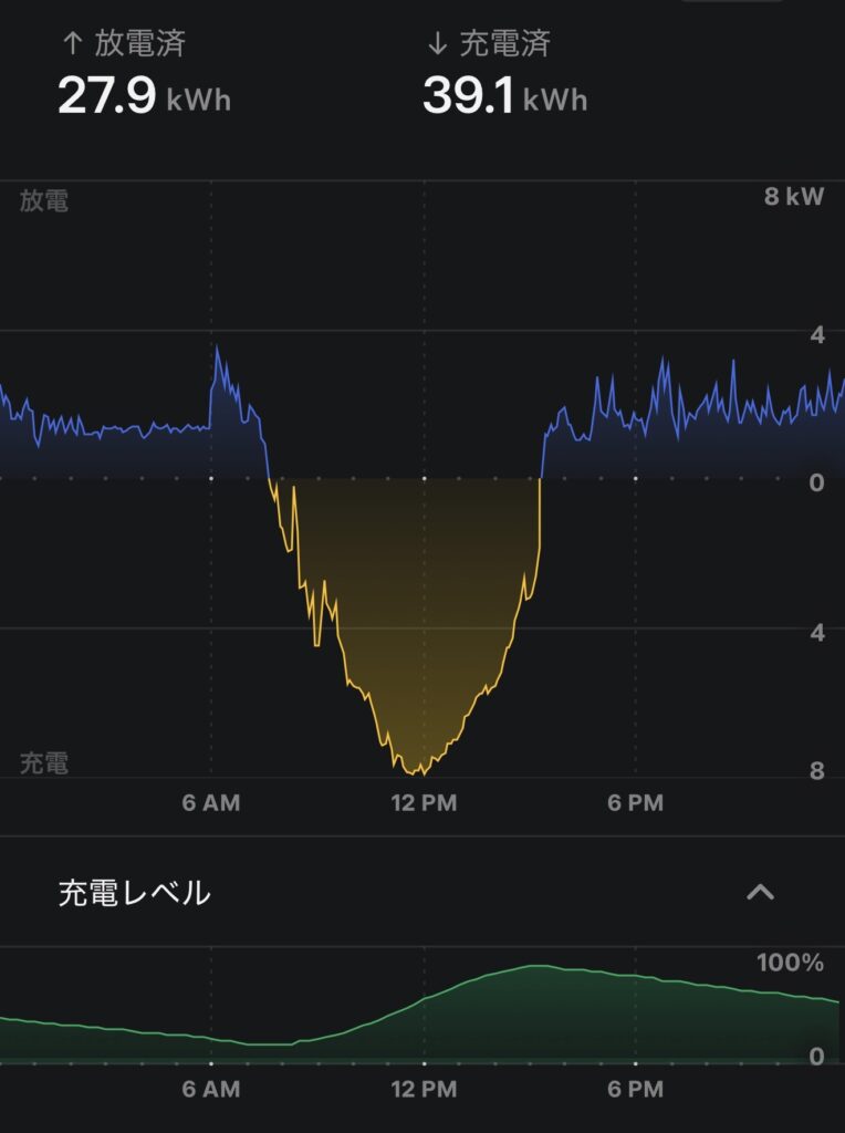 昼前から夕方にかけての発電カーブはなだらかな山形で、最大でおよそ7kW前後まで出力が伸びています。この時間帯は自宅の電力とエコキュートの運転をまかなった上で、Powerwallへの充電にしっかり回すことができました。結果として、39.1kWhものエネルギーを蓄電でき、夕方以降の生活に備える理想的なオフグリッド運用となりました。